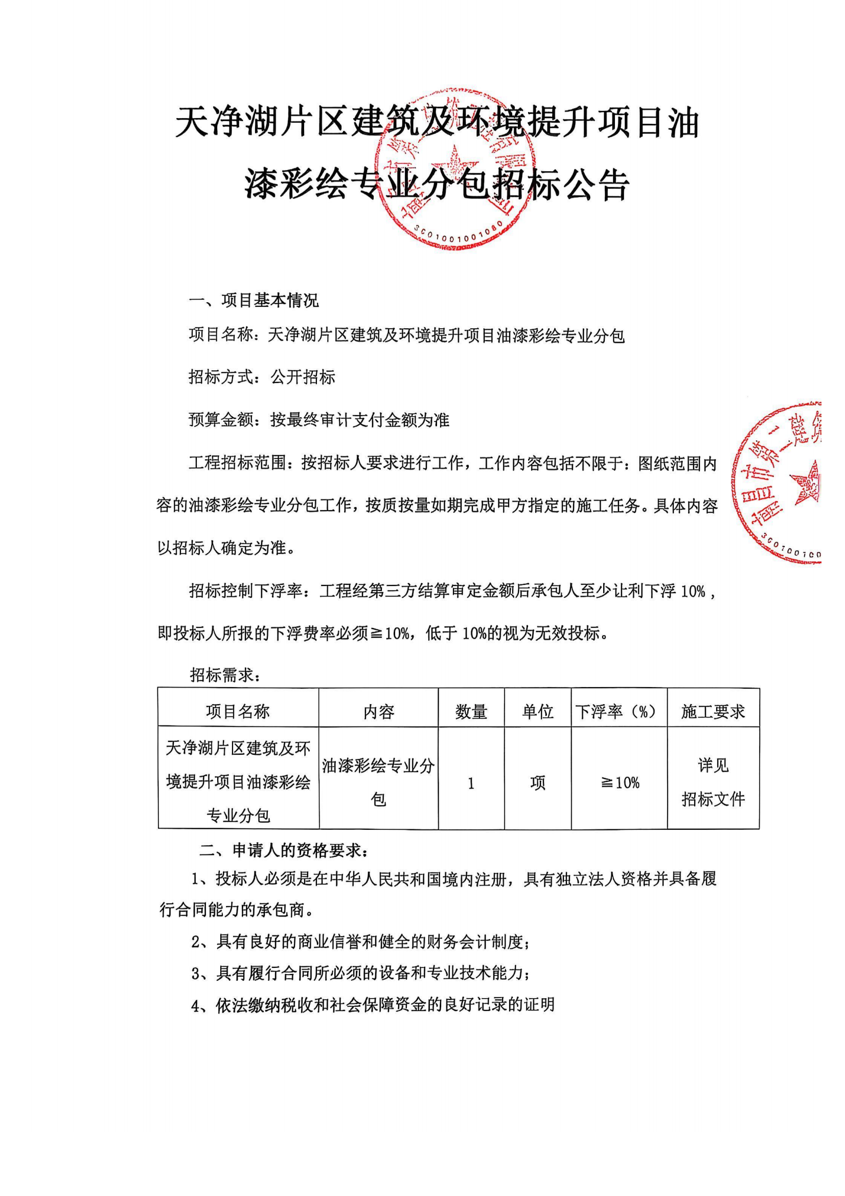 天凈湖片區建筑及環(huán)境提升項目油漆彩繪專(zhuān)業(yè)分包招標公告